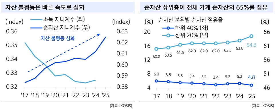 집 한 채가 수년 치 노력을 뛰어넘는다 : 가계 자산의 약 70%가 부동산에 묶인 구조에서 상위 20%는 전체 자산의 65%를 차지하고, 하위 40%의 몫은 단 4.8%에 불과해요. 보고서는 "부동산으로 벌어진 자산 격차는 한 번 고착되면 정책으로도 되돌리기 쉽지 않다"고 경고합니다.